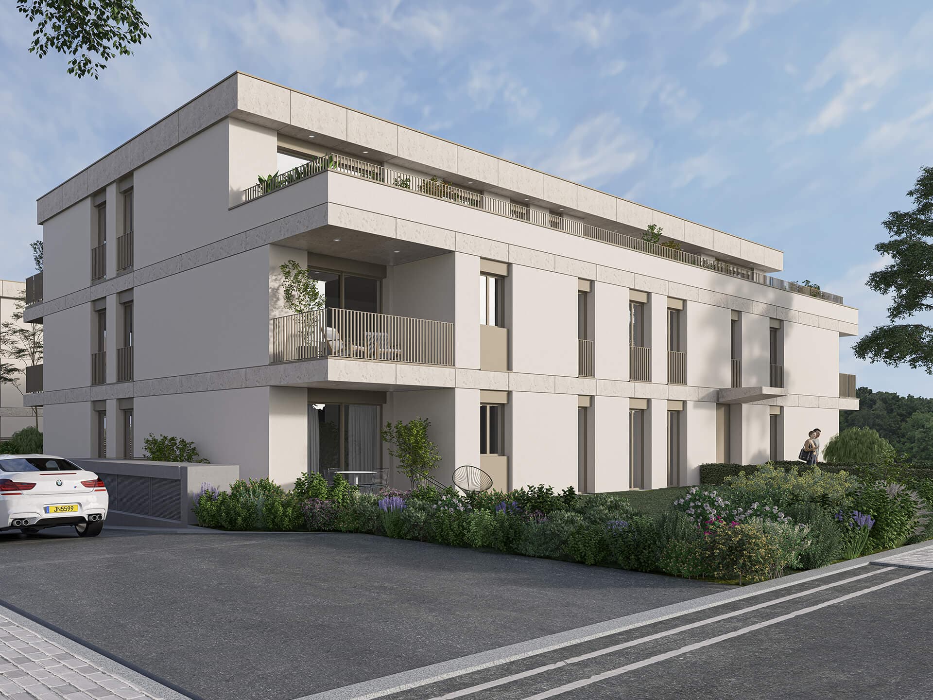 Le sous-sol commun comprend les caves et emplacements de stationnement. Tous les appartements de la résidence disposent d’une terrasse et/ou loggia.